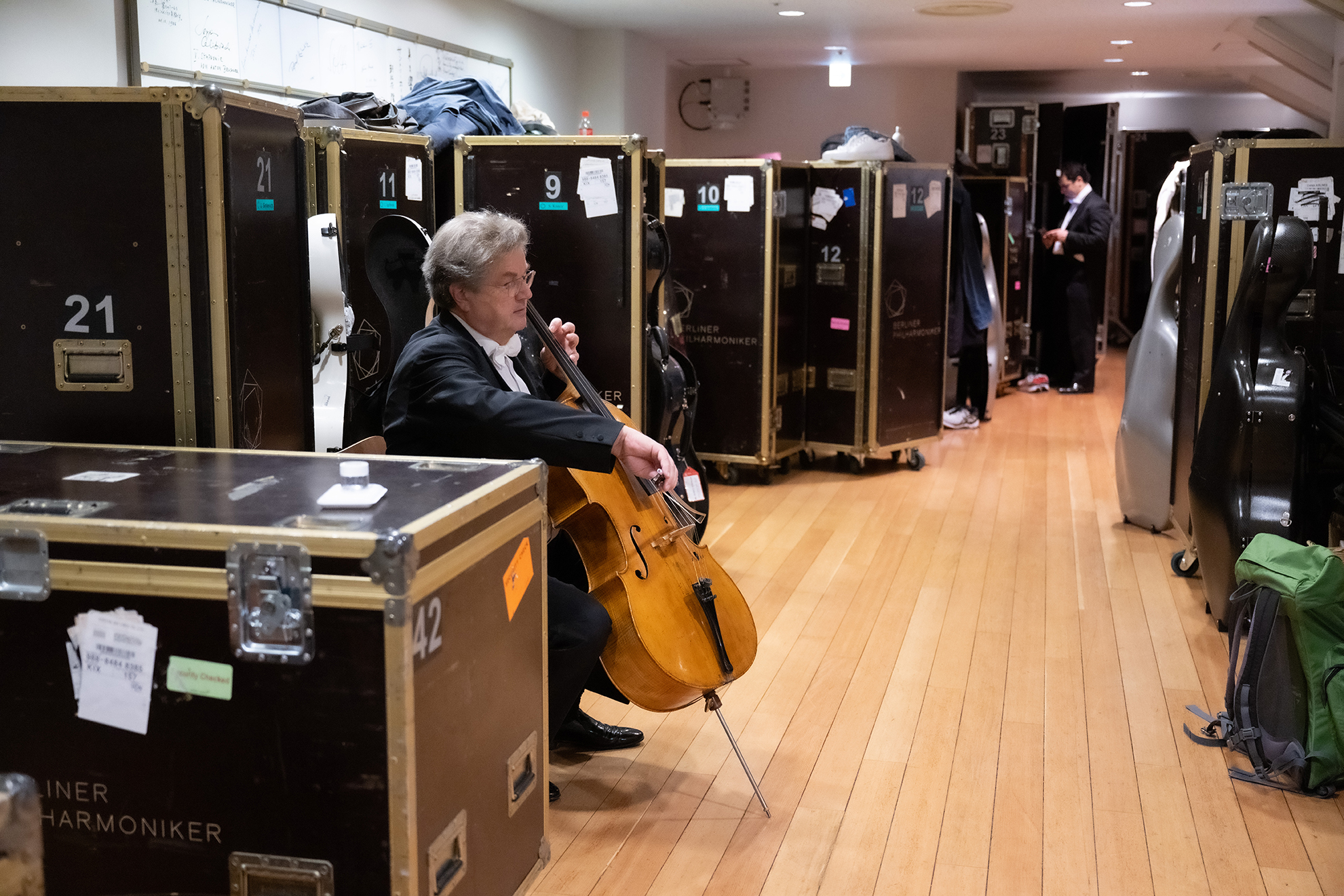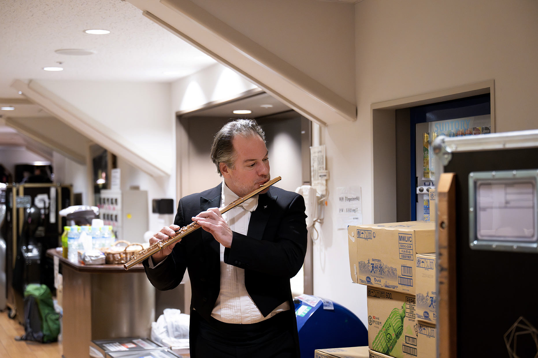 Zwischen Getränkenachschub und Frackkisten spielt sich Soloflötist Emmanuel Pahud ein. | Bild: Monika Rittershaus