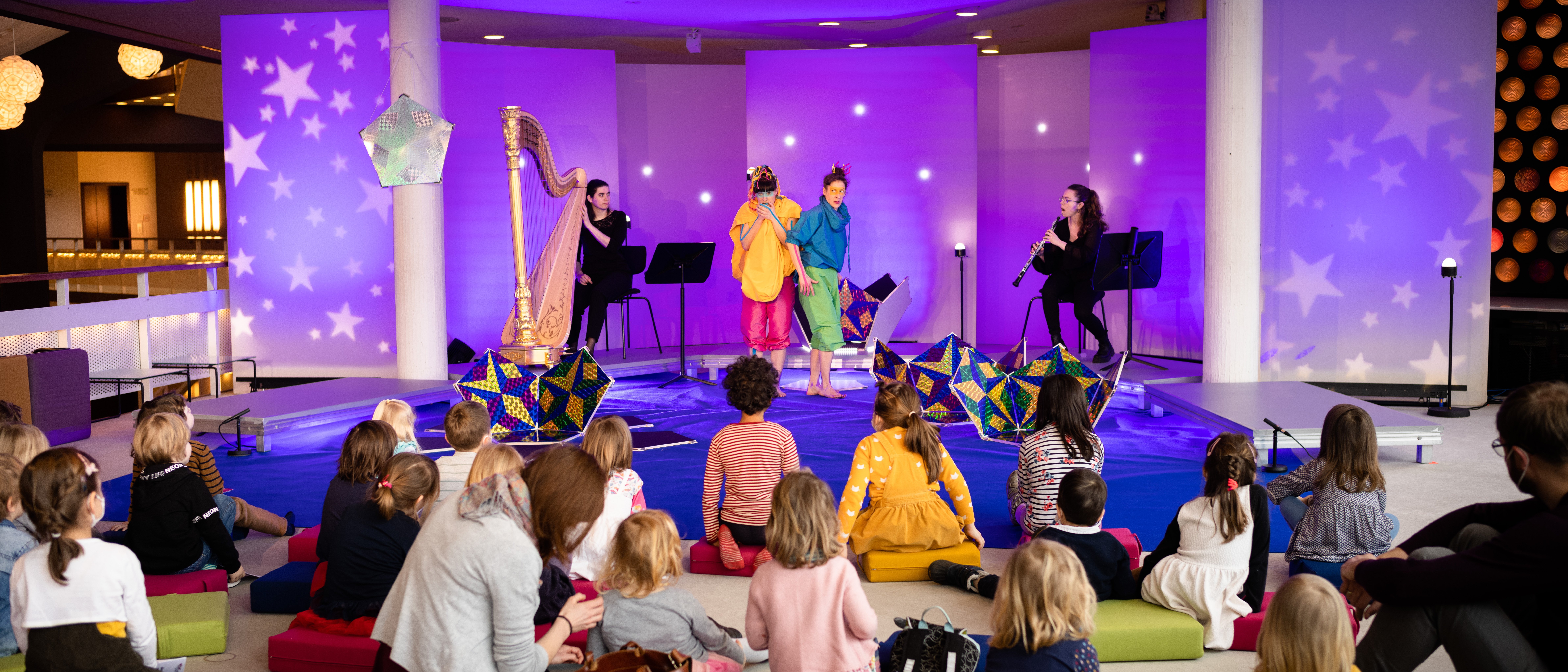 Surrounded by the colourful glass windows of the Philharmonie Berlin, our interactive concerts invite even the youngest children to explore music, to laugh, move and investigate sounds and rhythms in a casual atmosphere. Chamber ensembles from the Berliner Philharmoniker and the Karajan Academy present music of different genres at the highest artistic level. Two gaily coloured creatures spin tales full of dancing and fun from the music, entirely without words. The tonal colours of the instruments and the richness of classical music open the ears of the young and the young at heart. High spirits are guaranteed!