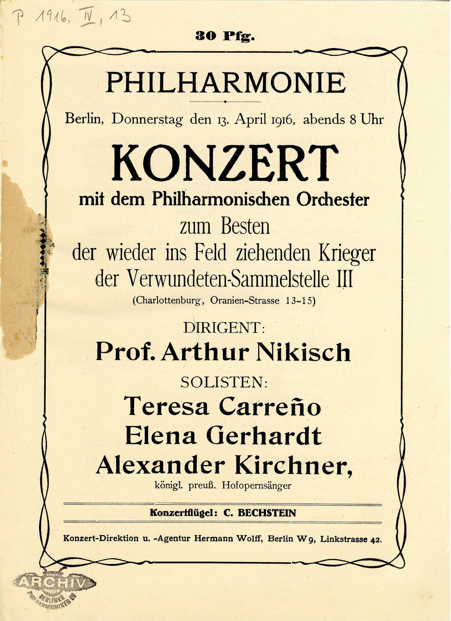 In view of these other challenges, the Berlin city council paid little attention to the new kind of influenza which also killed so many young people. While Dresden and Vienna, for example, decreed so-called “flu holidays” and temporarily closed the theatres and concert halls, no such measures were taken in Berlin – to the great relief of the concert organisers. In the newspapers of the time, the subject was hotly debated, but for the reporter of the Signale der musikalischen Welt, however, joy prevailed that “at a time when we need the consolations of music more than at any other, this last refuge is not also spoiled by a police ordinance. Of course the musical Berliners are still suffering enough from the terrible flu. At least two out of three singers cancel their concerts [...] Even the conductors are affected by the flu...” (30 October 1918). Berliner Philharmoniker concerts were also affected by such cancellations. The conductor Felix von Weingartner, for example, had to cancel the opening concert of his seven-part concert series with the orchestra due to his flu, and Arthur Nikisch, then chief conductor of the Philharmoniker, stepped in at short notice.