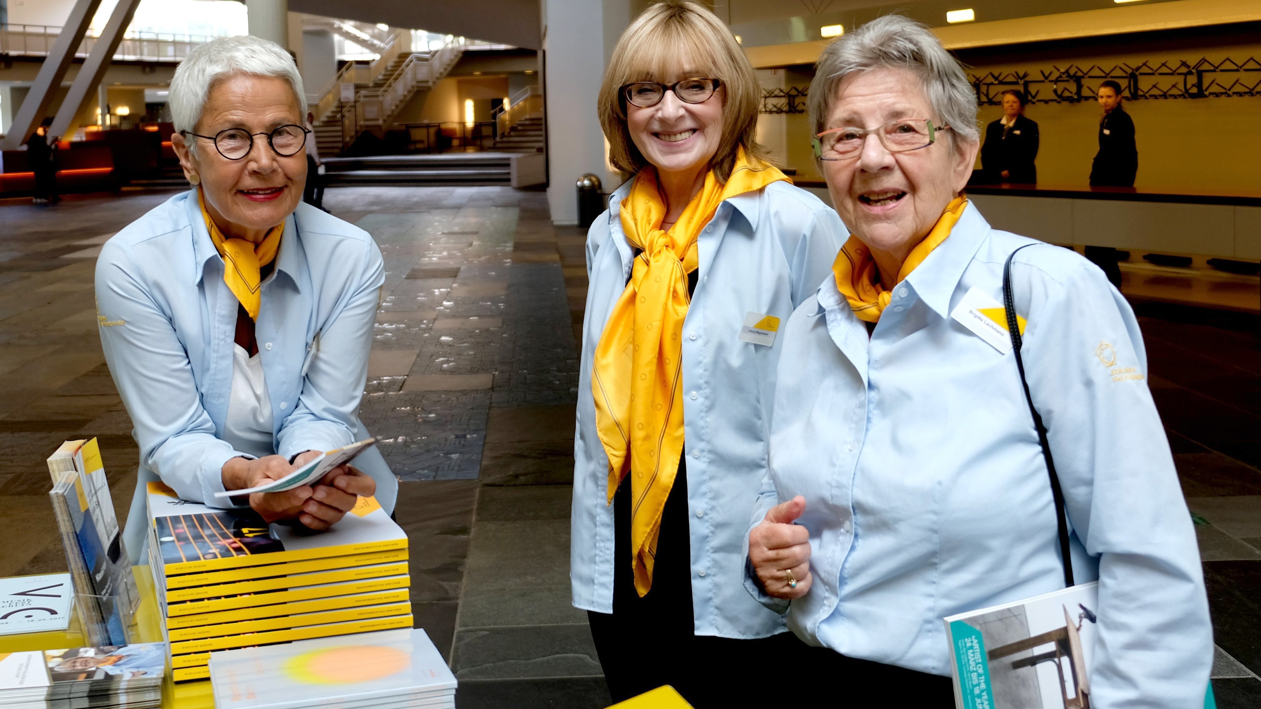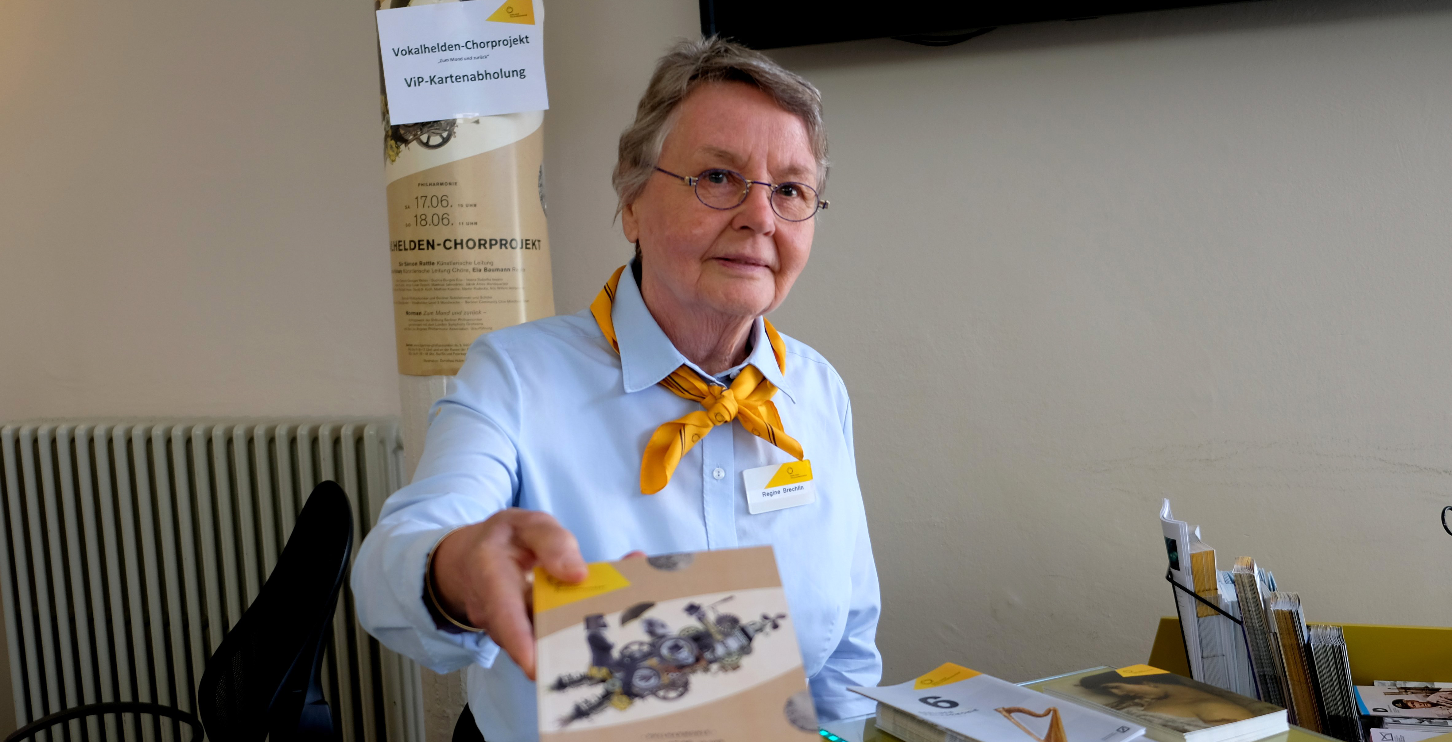 Sie sind die kompetenten Helferinnen und Helfer im Hintergrund: Egal, ob es darum geht, einem orientierungslosen Konzertgast den richtigen Weg zu weisen, Fragen rund um die Veranstaltungen und das abendliche Programm zu beantworten oder Wissensdurstigen Auskunft über die Philharmonie und das Orchester zu geben, die Ehrenamtlichen stehen als Ansprechpartner für das Publikum bereit. »Die Leute brennen für dieses Haus«, freut sich Gabriele Bühler, die Managerin des Ehrenamtlichen-Projekts. »Auf ihre Philharmonie lassen sie nichts kommen.« Als sie diesen Service einführte, glich das einer Pioniertat. Die ehemalige Anwältin hatte während eines längeren Amerikaaufenthalts das Volunteer Program des Kennedy Centers kennengelernt und dachte: »Das brauchen wir in Deutschland auch!« Zunächst baute sie ein kleines Freiwilligenteam am Konzerthaus am Gendarmenmarkt auf, 2007 konnte sie die Berliner Philharmoniker für ihre Idee begeistern.